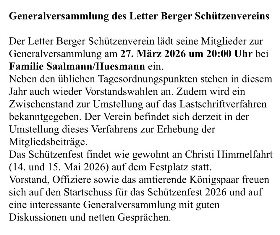 liebe Freundinnen und Freunde des Letter Berger Schützenvereins!
